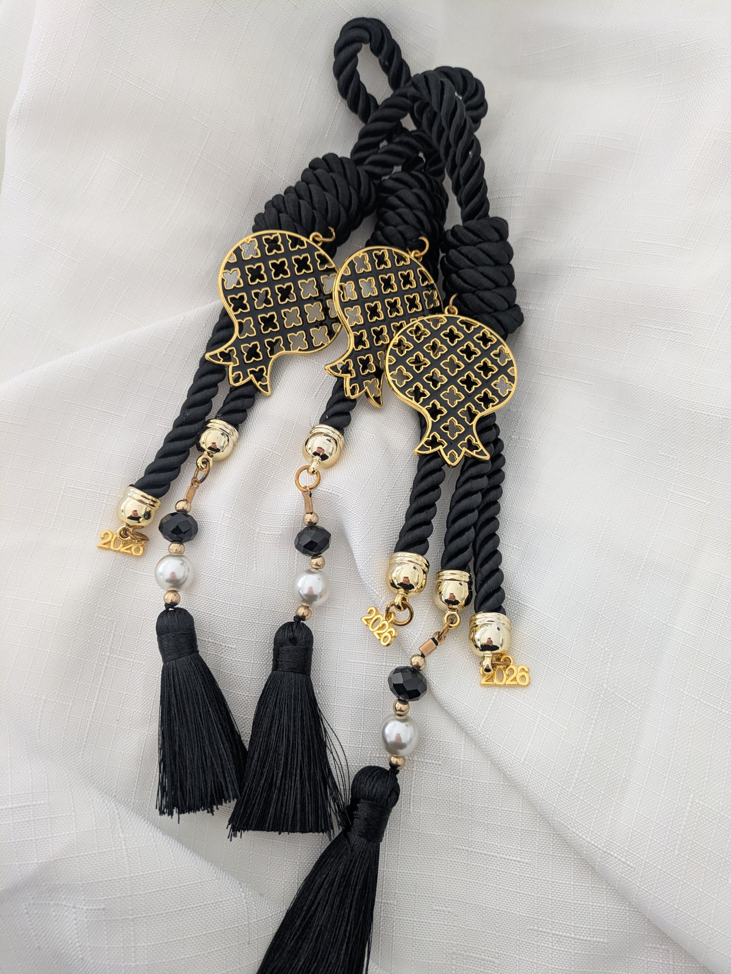 Consisting of round capped ends, beads, pearl, 2026 charm and finished off with a beautiful tassel.