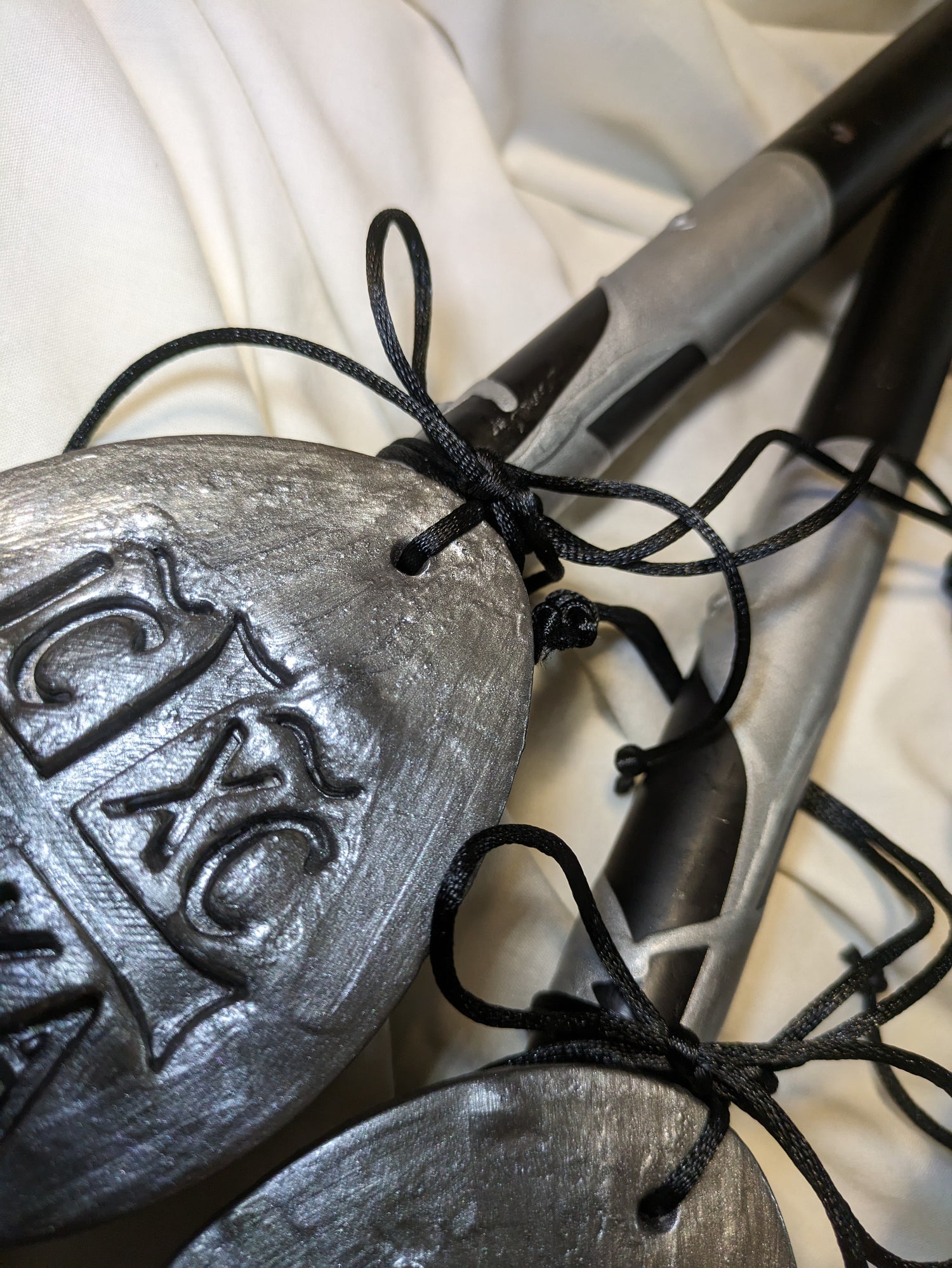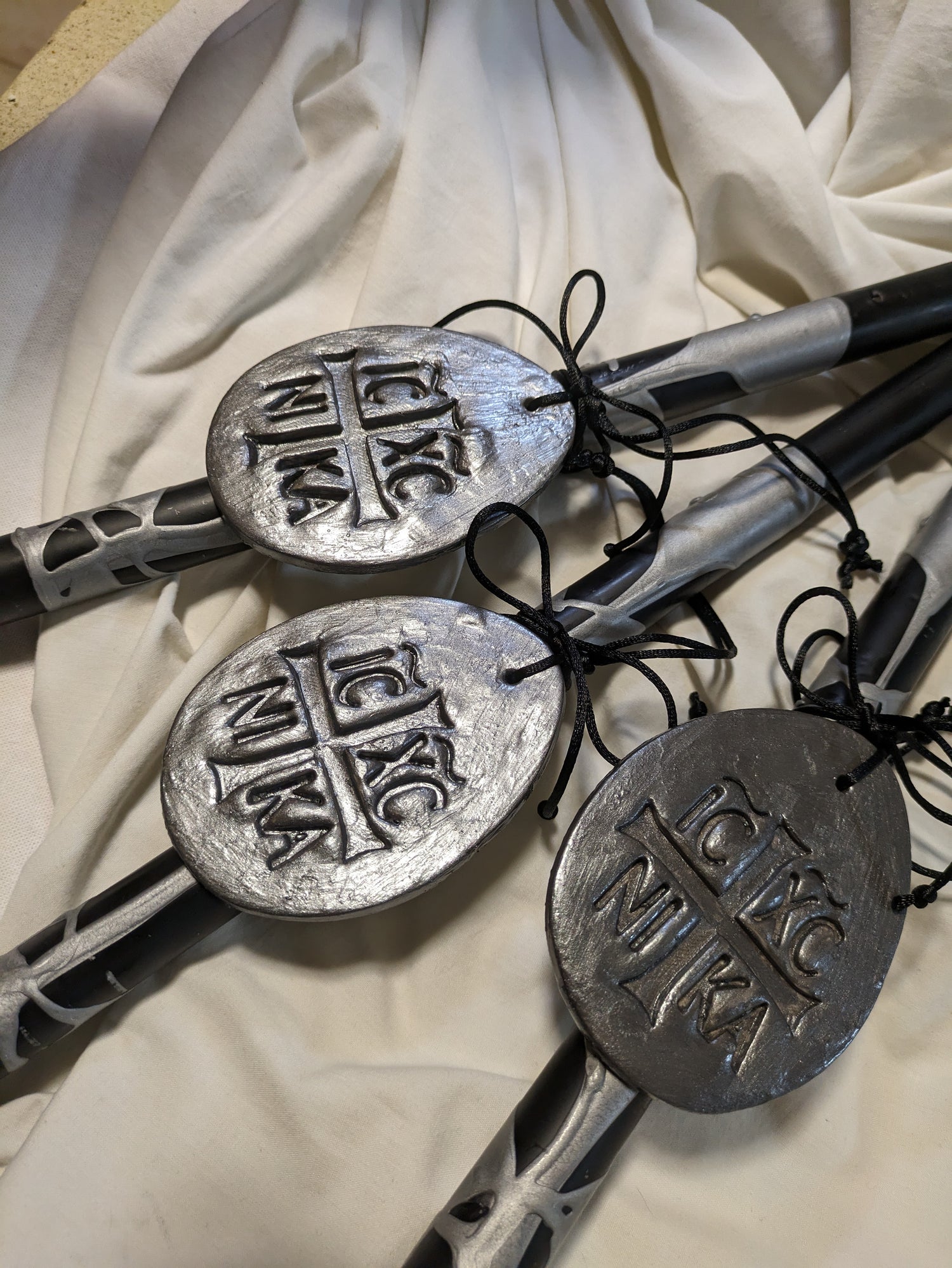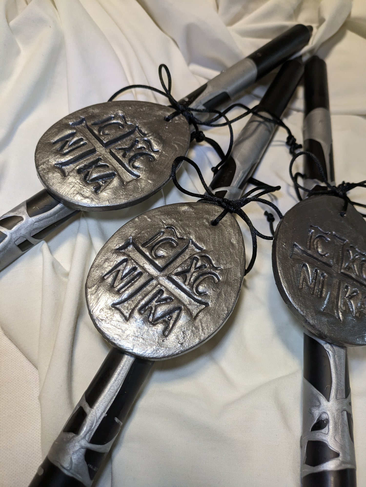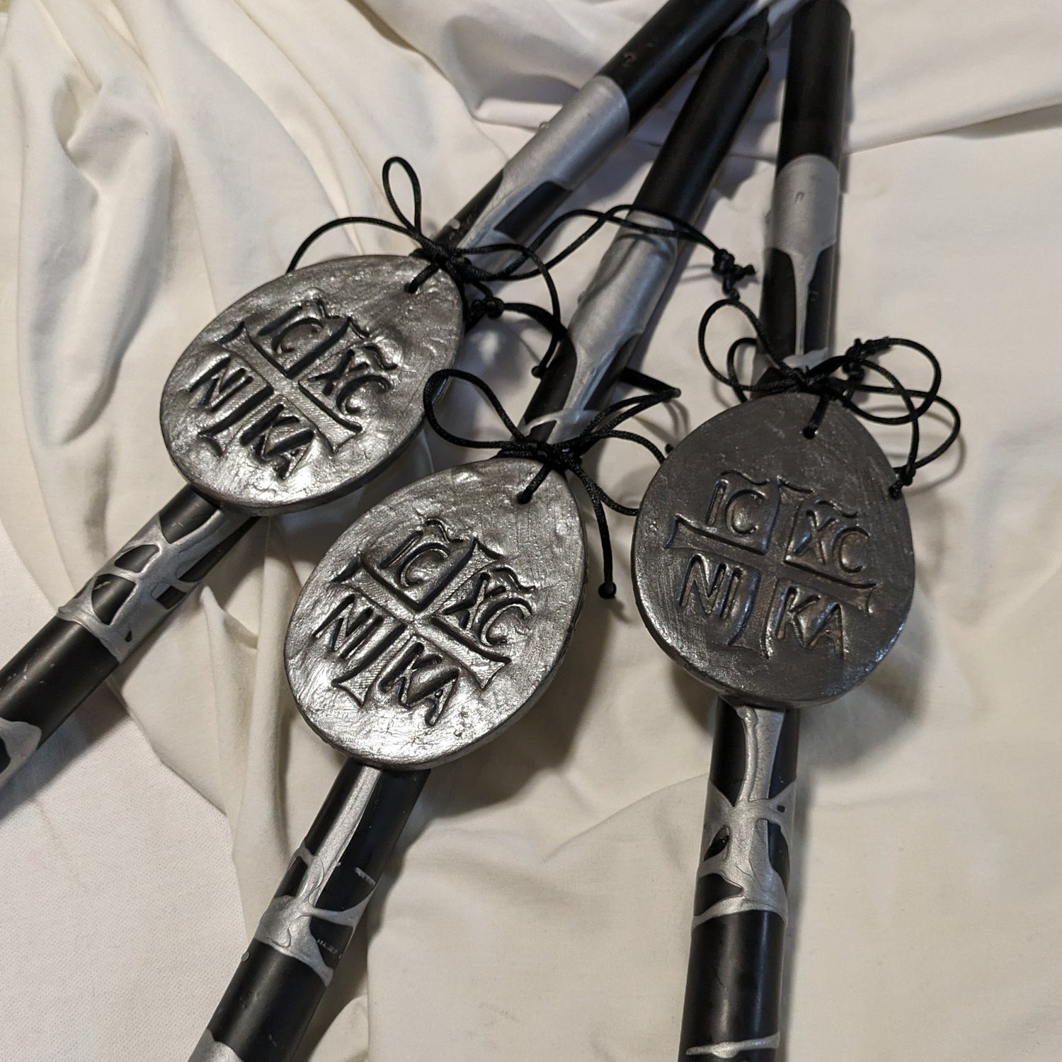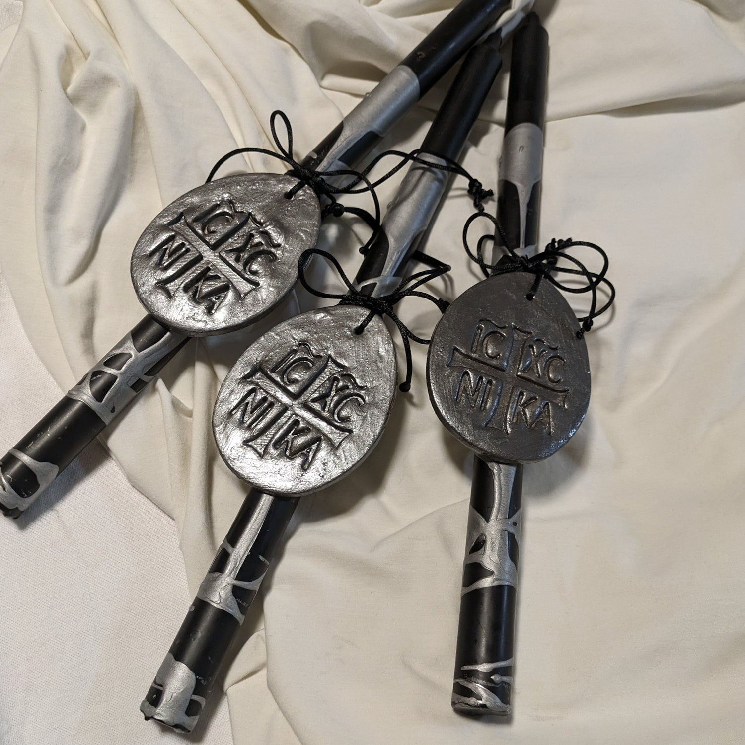 On a black and silver drip candle hangs a handpainted clay egg shaped hanging with the ICXCNIKA stamped into it.